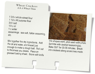 I use my wheat a lot, mostly for bread and extending ground meat dishes. But, periodically I try new recipes for using my wheat, this cracker recipe is one of those. They turned out pretty good despite: being thicker because I didn't roll them out terribly thin, I didn't season them enough (could've used more sea salt or Italian seasoning--both were great by the way on these), they were rather crunchy-almost too hard-not sure if this was because of being too thick or because I left them in the oven too long-oops. Will I try this recipe again? Definitely, it's a keeper.